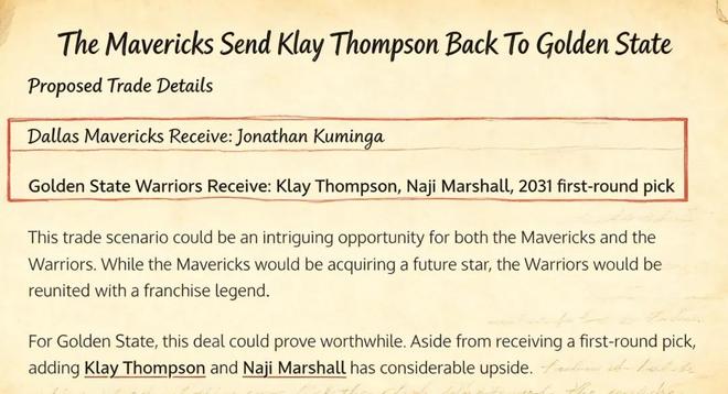 美媒《Fadeaway World》撰文建议,勇士可以将库明加送到达拉斯,换回克莱、马绍尔以及2031年的首轮签。
