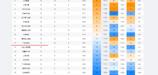 基础数据也印证了这一点。广东男篮16轮过后的百回合得分数为115.3,暂时仅高出联盟平均值0.3分,大概是联盟第12的水平。他们的百回合失分数是111.7,大概联盟第七的水平。