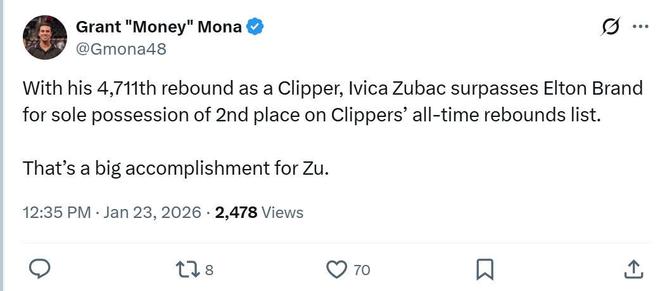 凭借这样的表现,祖巴茨快船生涯篮板总数来到4718个,超越埃尔顿-布兰德(4710),升至队史篮板榜第二,仅次于小乔丹(7988)。