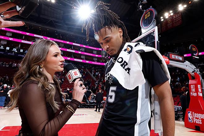 本场比赛中,马刺的先发得分后卫斯蒂芬-卡斯尔(Stephon Castle)也算是摆脱了之前几场比赛的糟糕状态。卡斯尔全场出场32分44秒,投篮12中7,三分线外2中1,罚球3中1,得到了16分5篮板6助攻2抢断的全面数据,还有2次失误和3次犯规,正负值为+3。卡斯尔在进攻端效率稳定,他的突破能力和终结能力相当不错,他也通过各种方式得到了不少分数,他也没有太过执拗,没有进行太多不合理的投篮,他还展现出了自己的传球能力和组织能力,在进攻端的贡献度非常全面。不仅如此,卡斯尔在防守端也是保持了极高的强度和专注度,证明了自己是一名非常优秀的防守者。总体来看,卡斯尔在本场比赛中的表现非常不错,他也为球队的胜利提供了不小的支持。