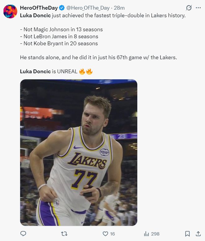 湖媒:东契奇刚刚完成了湖人队史最快三双纪录,这个纪录不是来自在湖人效力13个赛季的魔术师,也不是在湖人效力8个赛季的勒布朗,更不是在湖人效力20赛季的科比,而是仅仅代表湖人出战67场的卢卡。