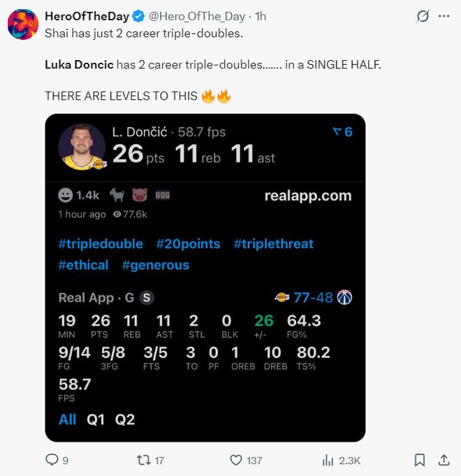 湖媒:东契奇生涯已经完成两次半场25+三双了,而亚历山大生涯才2次三双,两人根本不该同日而语。