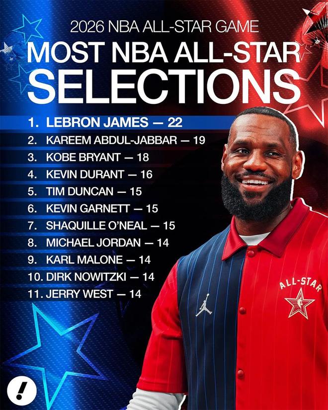 2、杜兰特生涯第16次入选全明星,历史第四,仅次于詹姆斯、贾巴尔、科比