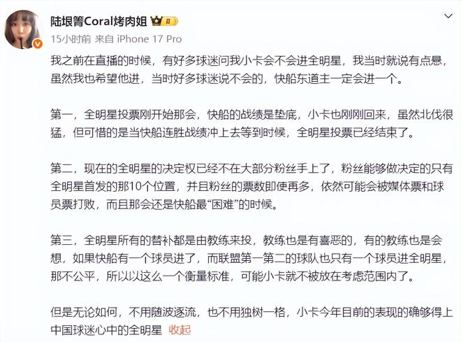 伦纳德的中方经纪人烤肉姐在社媒上详解了小卡落选全明星一事,她一早就说过小卡入选全明星有点悬。