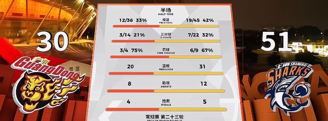 随后两队陷入长时间的得分荒,广东队直到还剩1分半时才把本节得分拉到两位数,大鲨鱼则是继续扩大领先优势。本节尾声古德温和张皓嘉发生了一点小摩擦,裁判吹罚张皓嘉技术犯规,半场结束,上海男篮领先优势来到21分。【广东 30-51 上海】
