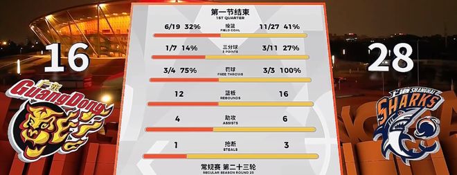 暂停回来广东队依靠罚球终于将比分提升到两位数,而此时上海男篮已经抢下8个前场篮板,首节结束时,上海男篮领先12分进入休息时间。【广东 16-28 上海】
