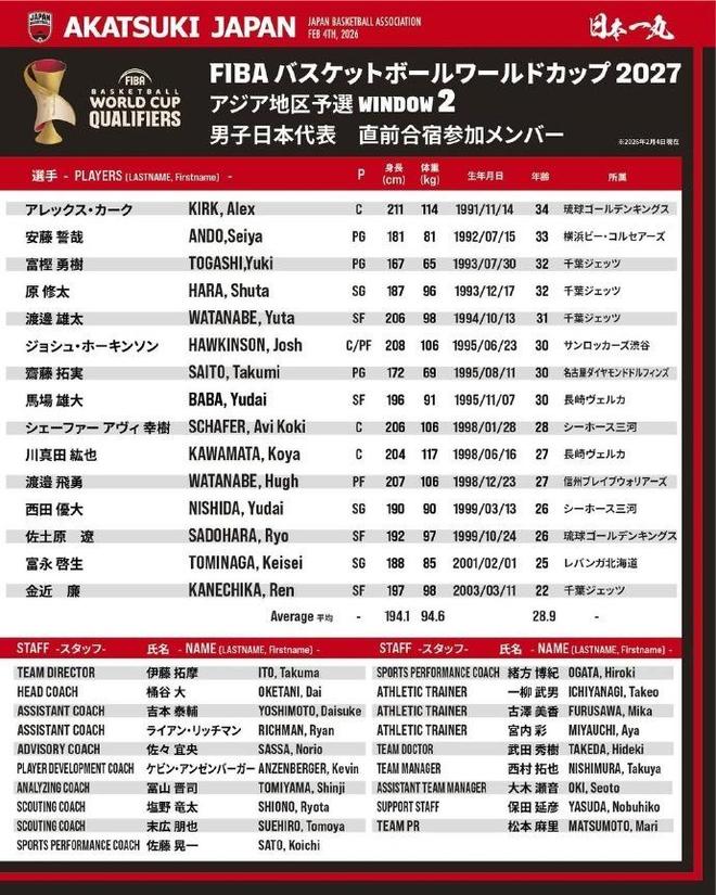 北京时间2月4日,在中国男篮公布21人集训名单后,如今日本男篮公布15人集训名单,由渡边雄太领衔,还有两位归化球员霍金森与阿莱克斯·柯克,而在公牛效力的河村勇辉不回归。