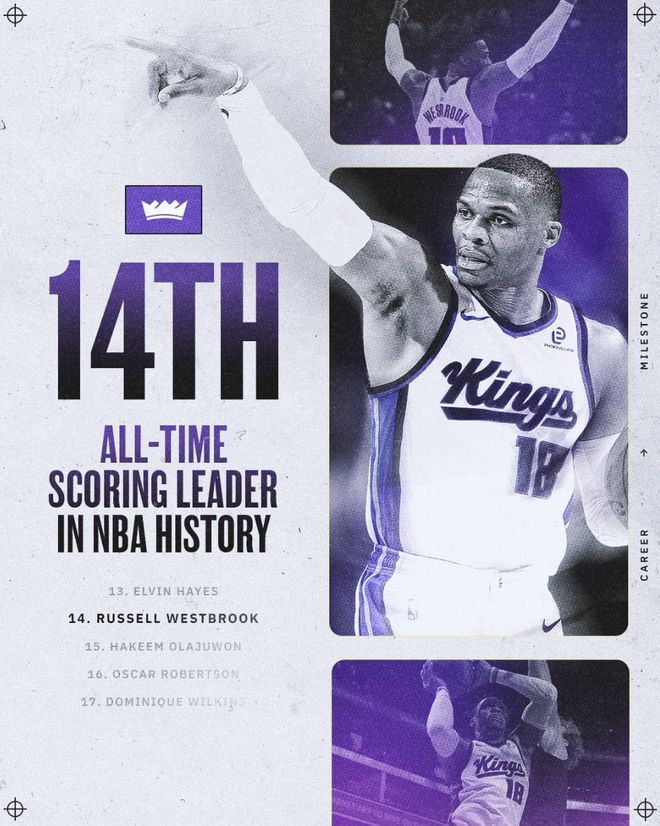 国王官方庆祝威少历史总得分榜升至第14位,超越奥拉朱旺26946分,下一个将追逐埃尔文-海耶斯的27313分。