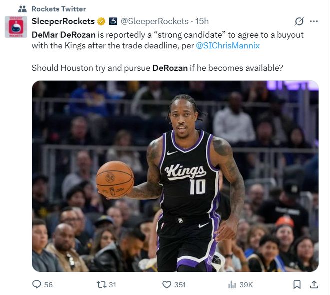这场比赛之前,《体育画报》记者克里斯-曼尼克斯透露,如果在交易截止日前无法把德罗赞交易出去,国王会裁掉德罗赞。在国王裁掉德罗赞后,洛杉矶快船、洛杉矶湖人会对他有意。休斯顿媒体也希望火箭可以追逐一下被买断后的德罗赞。