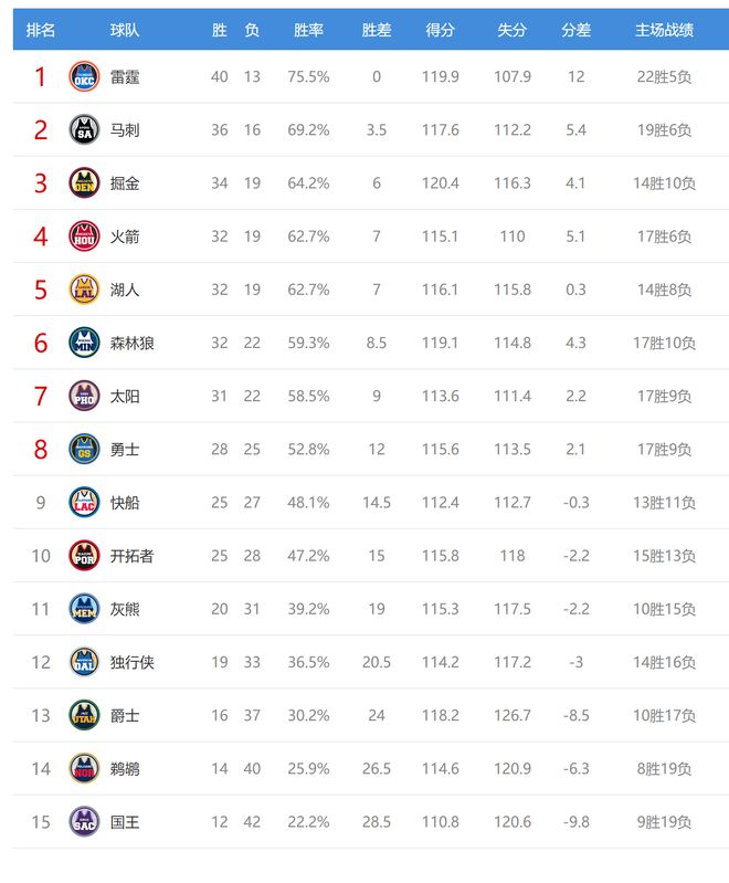 今日比赛后快船、开拓者排名互换,其他西部球队排名不变。