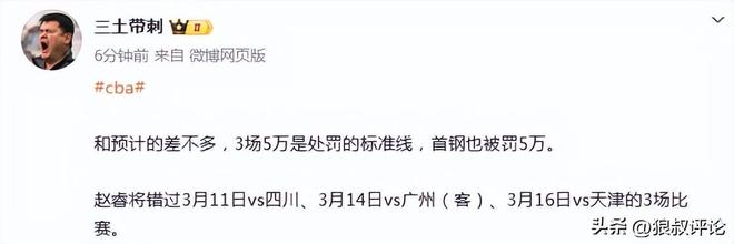 北京时间2月11日,CBA官方公示,北京男篮球员赵睿不当言论罚单,他将会被禁赛3场,罚款5万,而北京男篮则是核减经费5万。