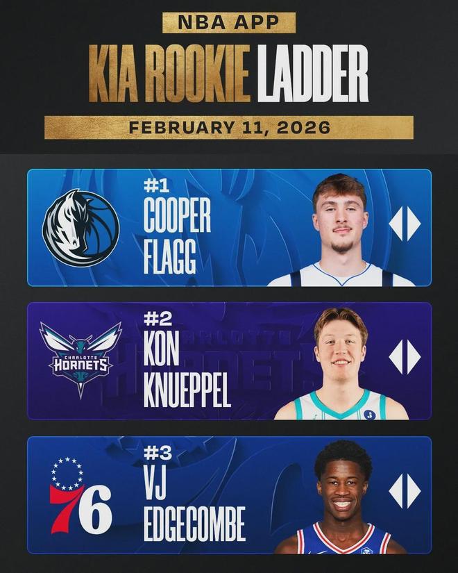 2025届新秀整体质量,比2024届要高出一大截。76人探花秀埃奇库姆位列新秀榜第三,鹈鹕13号秀奎因排名新秀榜第四,国王42号秀雷诺已经升至第五。马刺榜眼迪伦-哈珀暂列新秀榜第八,爵士5号秀艾斯-贝利排名第九。