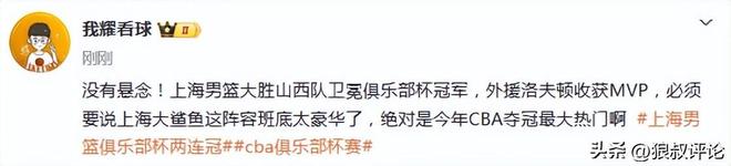 没有悬念!上海男篮大胜山西队卫冕俱乐部杯冠军,外援洛夫顿收获MVP,必须要说上海大鲨鱼这阵容班底太豪华了,绝对是今年CBA夺冠最大热门。