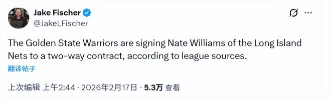 北京时间2月17日,据NBA名记Fischer报道,勇士将与内特-威廉姆斯签下一份双向合同。