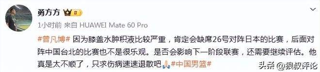 北京时间2月22日,根据北京记者“勇方方”发文:曾凡博因为膝盖水肿积液比较严重,肯定会缺席26号对阵日本的比赛,后面对阵中国台北的比赛也不是很乐观。