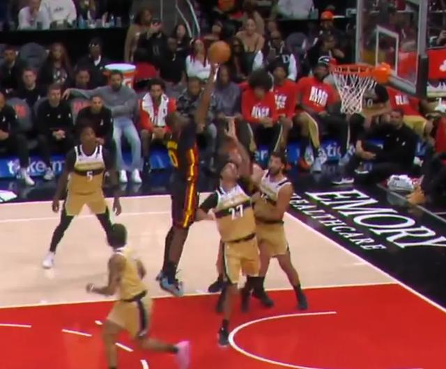 第一节还有一个球,库明加在突破到篮下已经起跳的情况下,依然找到了底角的队友,完成了一次三分助攻。在老鹰的首秀,库明加几近完美,唯一的瑕疵可能是在末节想要刷30分瞎打了两个。
