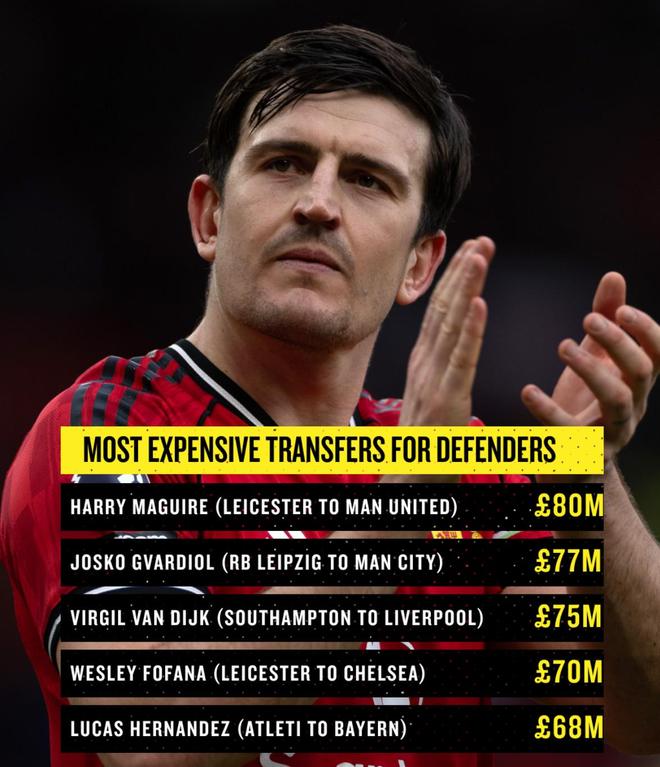 目前的世界纪录仍属于哈里-马奎尔,他在2019年以8000万英镑转会曼联。