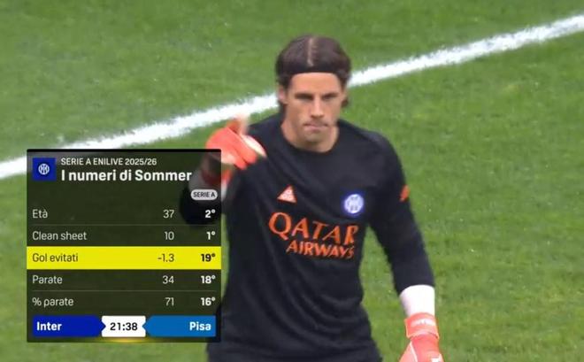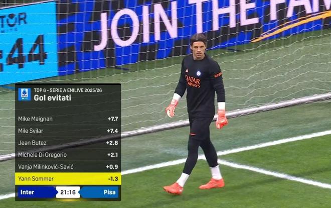 事实上赛前转播商DAZN还公布了一组本赛季意甲门将阻止对手预期进球的数据,其中米兰队长迈尼昂以7.7球高居榜首,罗马门将斯维拉尔则是7.4球位居第二。而索默在这项数据上却是尴尬的-1.3,这意味着他甚至还让对手进了更多的球。