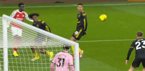 第29分钟,多古头球解围不远,萨卡右路横传,厄德高顺势推射,利桑德罗-马丁内斯解围踢空,球飞入球网。