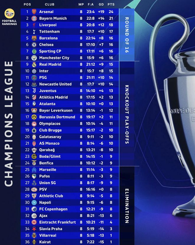 欧冠最终积分榜上,8轮15分的皇马位居16分的曼城之后,排名第9位,无缘直通淘汰赛,本菲卡排名第24,惊险晋级附加赛。姆巴佩本赛季欧冠为皇马出战7场比赛攻入13球,排名射手榜第1位,在拥有欧冠最佳射手的情况下,皇马却要去踢附加赛。