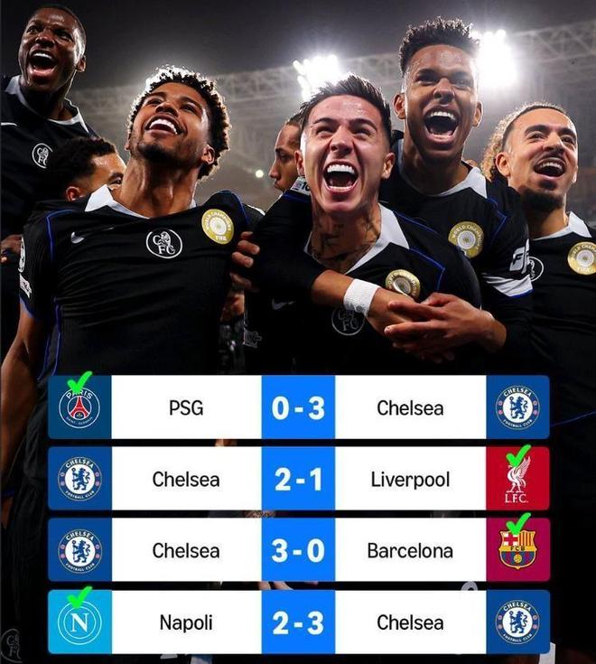 随着切尔西在欧冠联赛阶段最后一轮,在客场3比2逆转击败意甲卫冕冠军那不勒斯,蓝军在过去7个月时间里,创造了一项神奇的壮举。那就是切尔西在一年之内,先后击败法甲和欧冠冠军大巴黎,英超冠军利物浦,西甲冠军巴萨以及意甲冠军那不勒斯。