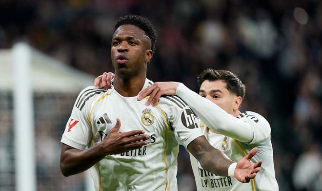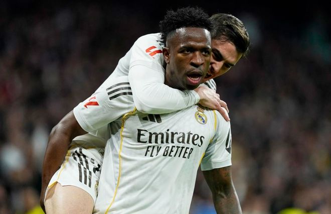 比赛刚刚开始不久,巴列卡诺就反客为主创造出非常好的机会。阿霍马克在禁区内摆脱3人包夹,带球突破到禁区中路,起脚低射近角,结果踢偏了。第10分钟,贝林厄姆大腿拉伤,受伤下场,他痛苦落泪。卜拉欣-迪亚斯替补上场。5分钟后,皇马进球了!维尼修斯在禁区左侧过人后晃开角度,起脚兜射远角,皮球应声入网!这粒进球完全是依靠个人能力,非常漂亮!