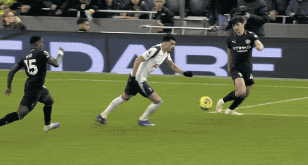 通过慢动作可以清楚看到,索兰克踢到了格伊的脚踝,格伊踢到了球,皮球才进了球门。也就是说,进球前,索兰克疑似犯规。