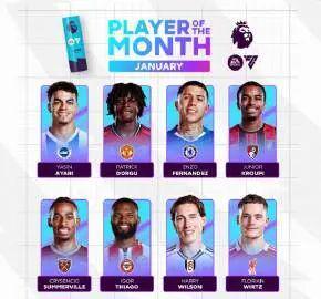 多尔古和库尼亚在对阵阿森纳比赛中的进球入围英超1月最佳进球候选;