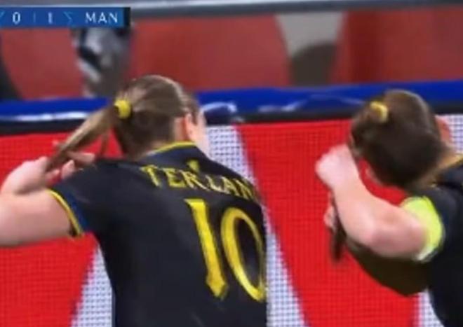 伊丽莎白-特兰在比赛第三分钟首开纪录,这位进球功臣与英格兰后卫马娅-勒蒂西耶一起做出了假装剪马尾的动作。