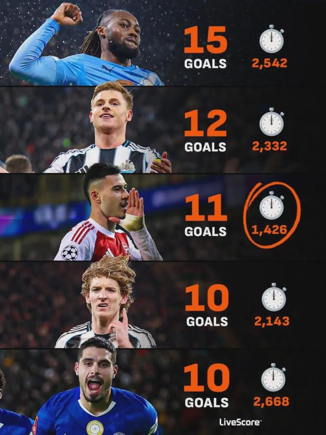 (对狼队之前)数据统计,本赛季各项赛事打进10球以上的英超边锋中,马丁内利是用时最少、效率最高的。