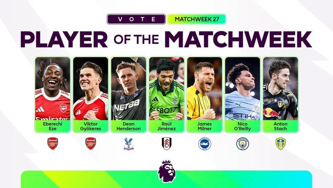 北京时间2月24日,英超官方公布了联赛第27轮最佳球员候选名单,这7名球员为埃泽、哲凯赖什、迪恩-亨德森、劳尔-希门尼斯、米尔纳、奥赖利、施塔赫。