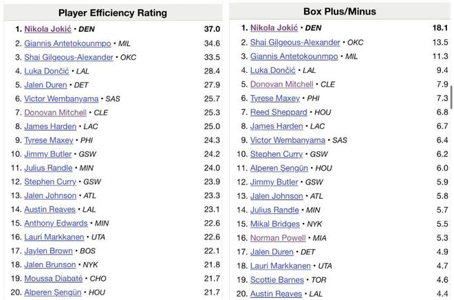 高阶数据方面,亚历山大目前PER值和BPM也都是历史级别,无奈身前有个真正的怪物——这也是一个非常有意思的地方,亚历山大本赛季的表现放在绝大多数赛季都是毫无争议的MVP第一,但是目前他只能排在第二,只因为前面还有个约基奇。