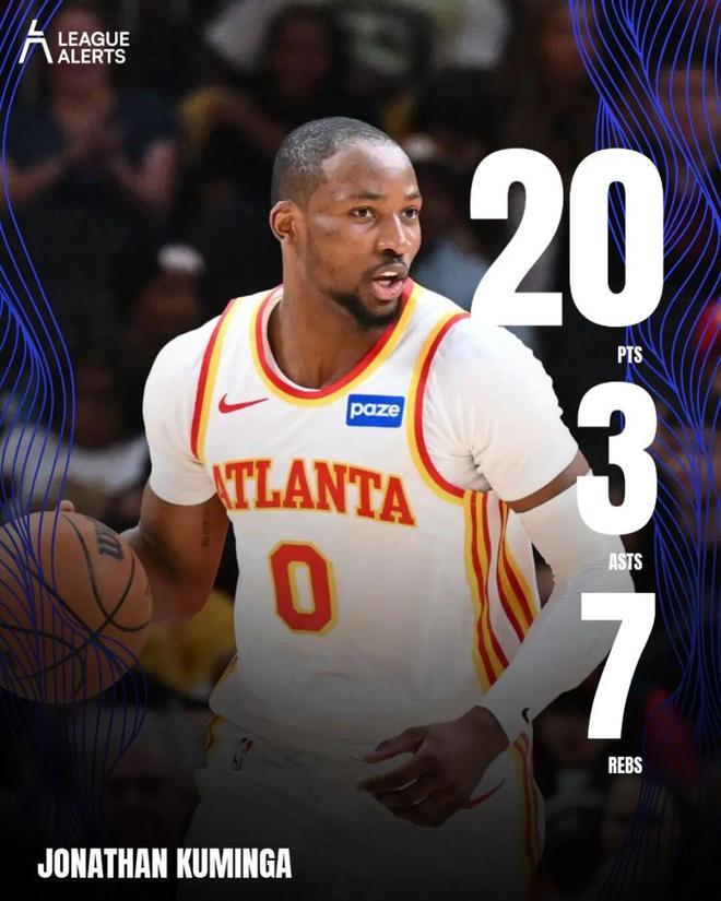 这场比赛,老鹰新援库明加再次打出了优秀表现:替补出战25分钟,投篮10中7,三分2中1,罚球7中5,拿下20分7篮板3助攻2抢断。