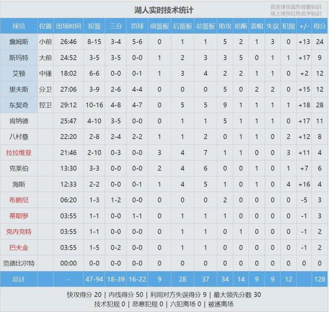 三节战罢,湖人96-76领先整整20分。詹姆斯前三节11中5得到14分,第四节4中3砍下10分。最后半节双方换上纯替补阵容,全场结束,湖人128-104大胜国王24分,背靠背取得2连胜。东契奇28分5板9助、詹姆斯24分5助2断。