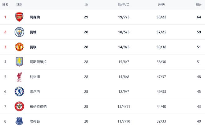 在积分榜上,阿森纳以64分领跑,战绩是19胜7平3负。曼城拿到59分,排名第2。阿森纳比曼城多了5分,但比曼城多踢1场。曼联赢球之后升到了第3名,总积分达到51分。阿斯顿维拉也是51分,但净胜球远不如曼联,排名掉到第4。利物浦以48分排名第5。切尔西输球后,积分依然是45分,排名第6。布伦特福德43分,排名第7。